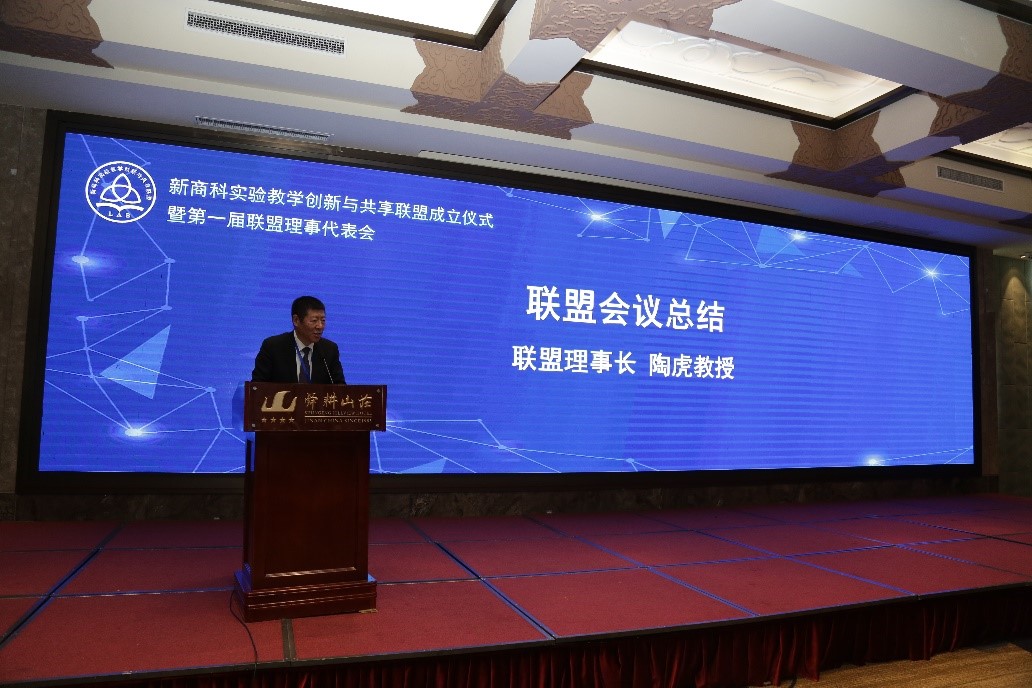 最后,联盟理事长陶虎对联盟会议进行了总结,指出本次会议有三个特点:一是高度重视,积极参与;二是深受鼓舞,充满期望;三是满怀信心,前景可期。陶虎将“求实、务实、落实”,“用心谋事、精心做事、力求成事”作为联盟工作奋斗的方向,相信在“创新、协调、绿色、开放、共享”新发展理念指导下,在各联盟高校成员单位、企业成员单位的大力支持下,联盟必将迸发出蓬勃的生机与活力,构建起资源丰富、规范有序、差异发展、协同高效的协同育人生态圈,推动新商科人才培养高质量发展。