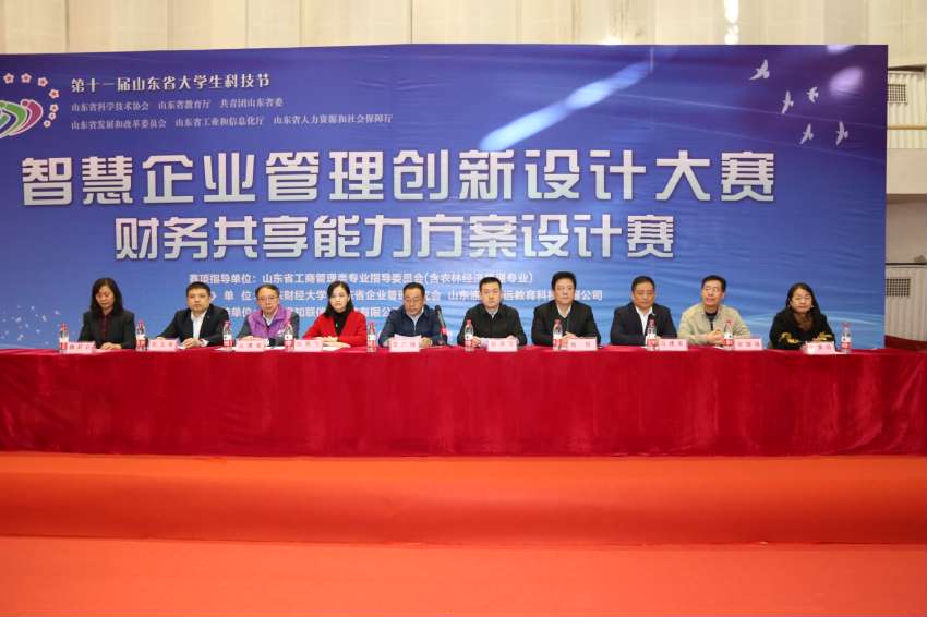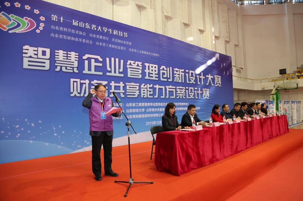 2019年10月26 日,由山东省科学技术协会、山东省教育厅、共青团山东省委员会、山东省发展和改革委员会、山东省工业和信息化厅、山东省人力资源和社会保障厅共同主办的第十一届山东省大学生科技节“智慧企业管理创新设计大赛——财务共享能力方案设计赛”在山东财经大学舜耕校区体育馆正式举行。山东省人力资源和社会保障厅就业促进处李广瑞处长 ,山东省政协常委、山东省企业管理研究会孙录宝会长,山东省教育科学研究院高等教育研究所刘燕飞主任,山东财经大学就业指导处杨哲处长,大会裁判长、全国高等财经教育实验发展研究协作中心副主任委员、山东省实验室与实验教学指导委员会委员、山东财经大学实验教学中心主任丛建阁教授,山东财经大学实验教学中心副主任宫锡强,浪潮国际副总裁兼CFO、浪潮铸远教育科技有限公司董事长张玉新先生,浪潮铸远教育科技有限公司总裁马建军先生等人参加了开幕式。大会由山东财经大学实验教学中心副主任魏莉莉主持。